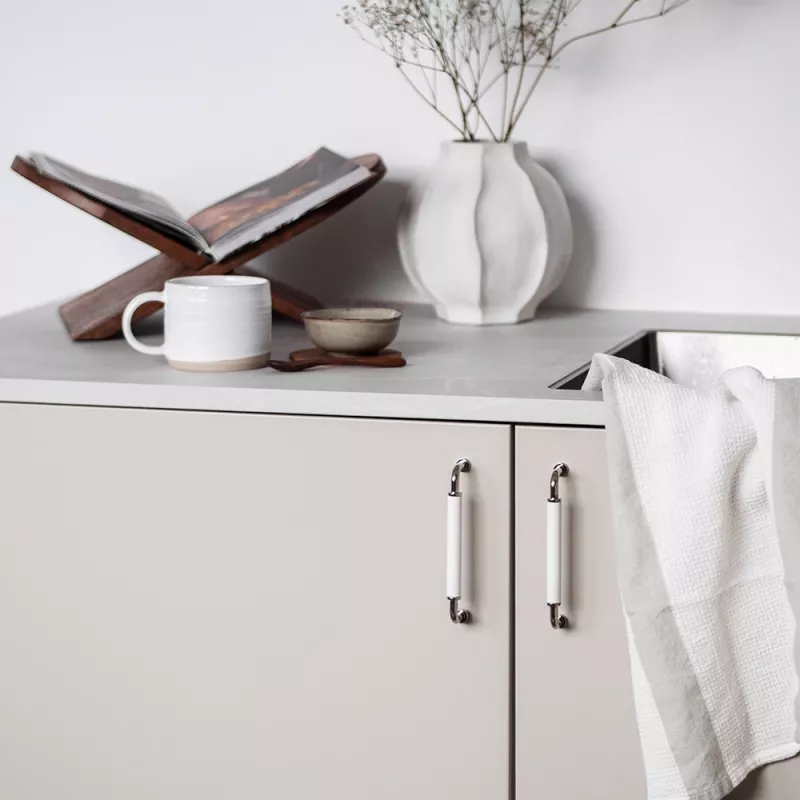 Lidhult i vitt med nickel är ett tidlöst handtag med ett mjukt och harmoniskt uttryck, skapat för att passa naturligt in i hemmets olika rum.