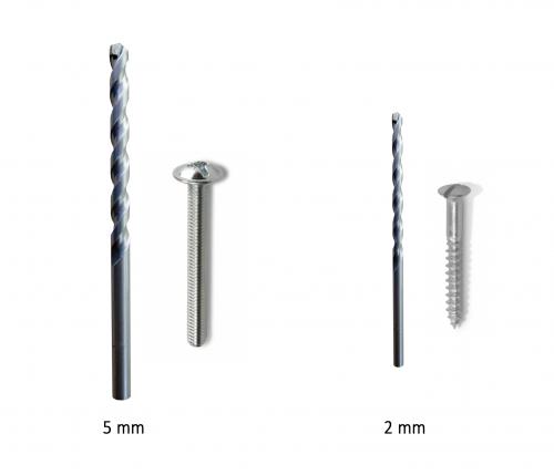 - Har du handtag med M4-skruv borrar du med ett 5 mm borr och har du beslag som monteras med träskruv kan du förborra med ett 2 mm borr.