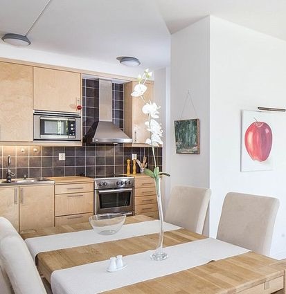 Här är mäklarbilden från köket när jag flyttade in i lägenheten i november 2013. Gulnande furuluckor, svart kakel och klassiska t-handtag. När jag hade bott här en liten stund så kände jag att köket var något jag verkligen ville göra om. Luckorna var faktiskt ännu gulare i verkligheten och eftersom att köket sitter ihop med vardagsrummet så blev det så trångt och påträngande när det var trä och svart och så i köket.