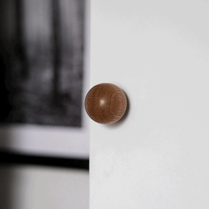 - Träknopp Ball i svartbetsadek. Ekknopparna valde vi även att betsa i svart för att passa många fler hem. Svarta inredningsdetaljer har dominerat i skandinaviska hem under 2020-talet och vitt är tidlöst minimalistisk när det kommer till heminredning. En träknopp med lätt betsad yta gör att trästrukturen och ådringen fortfarande framträder tydligt men färgen är fortfarande mest framträdande. Både de svartbetsade knopparna har en tunn bets där ekens ådringar lyser igenom och ger en träkänsla.