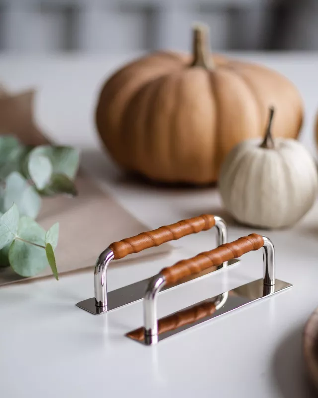 The first impression when you walk into your kitchen sets the tone for the entire room. These handles in polished nickel with a beautifully leather-wrapped grip in a cognac brown shade are perfect for creating a warm and inviting feel. Combine them with the earthy tones of autumn for a style that feels both modern and timeless. They work equally well in a minimalist kitchen or a more traditional space, and will definitely catch the eye.