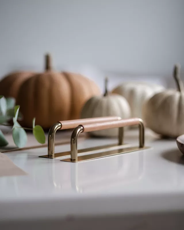 For those seeking a more sophisticated touch, our brass handles with natural leather are the ultimate choice. The golden brass combined with the soft, light leather creates a harmonious combination that elevates any kitchen cabinet or drawer. Perfect for those who want to add a bit of luxury without compromising on natural materials. Picture these handles in a kitchen filled with warm autumn tones, surrounded by pumpkins and rustic details – an image of modern elegance.