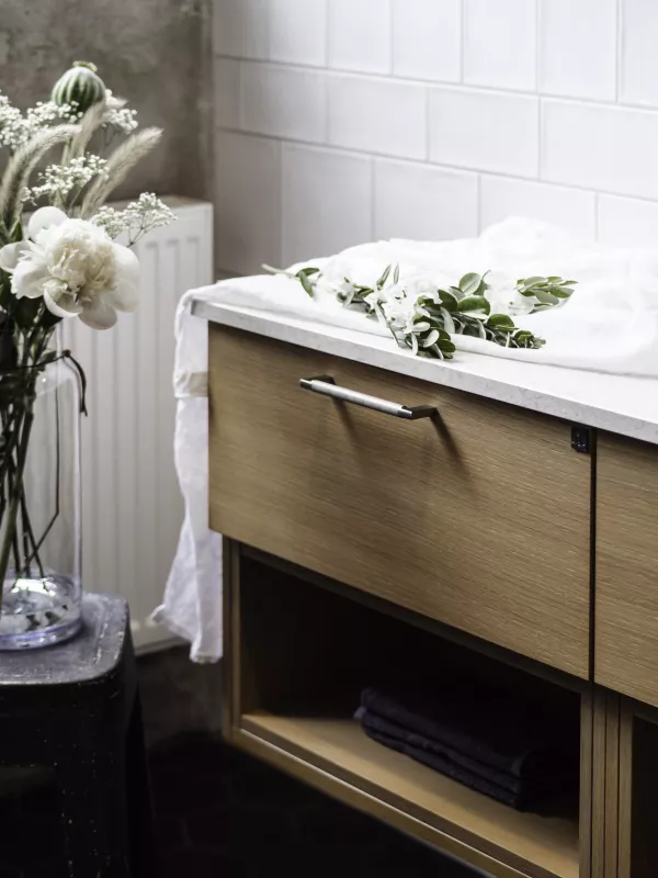 The grooved surface gives the handle character – both visually and to the touch. It’s not only stylish but also functional. Perfect in a bathroom where details need to be practical and durable. Whether placed on drawers or cabinet doors, the handle adds an exclusive feel and a refined expression.