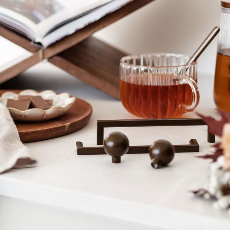 Kitchen: Pair our new handles and knobs with beige cabinets, walnut countertops, or white tiles. A fully brown kitchen feels both on-trend and cozy, while details in NCS S 8010-Y30R add an elegant, modern touch.