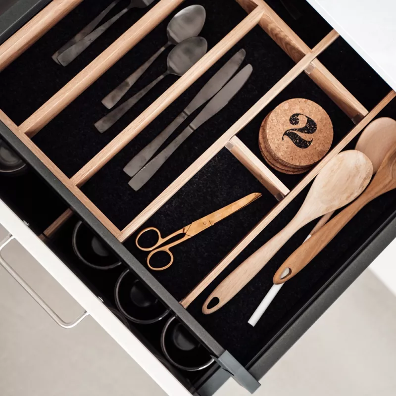 Beyond materials and colors, storage is also a key focus. Drawer organizers with smart inserts make it easier to keep utensils, spices, and kitchen tools in order. Pull-out shelves, corner carousels, and waste-sorting systems help maximize every inch of the kitchen for greater efficiency.