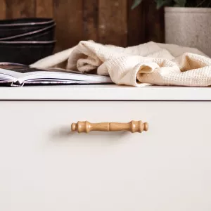 Nicely rounded kitchen handle in white wood and in a traditional design from the later 20th century.