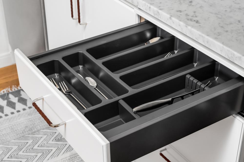 Try a custom-made drawer mat in dark gray felt to place in the bottom of your kitchen drawers.