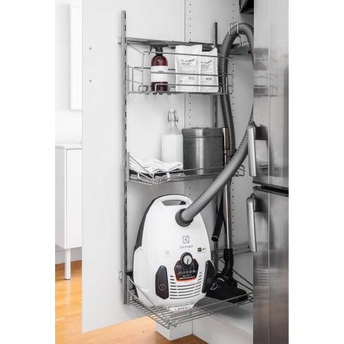 Cleaning cabinet fittings from Pelly with full extension for storage of vacuum cleaners and other cleaning products.