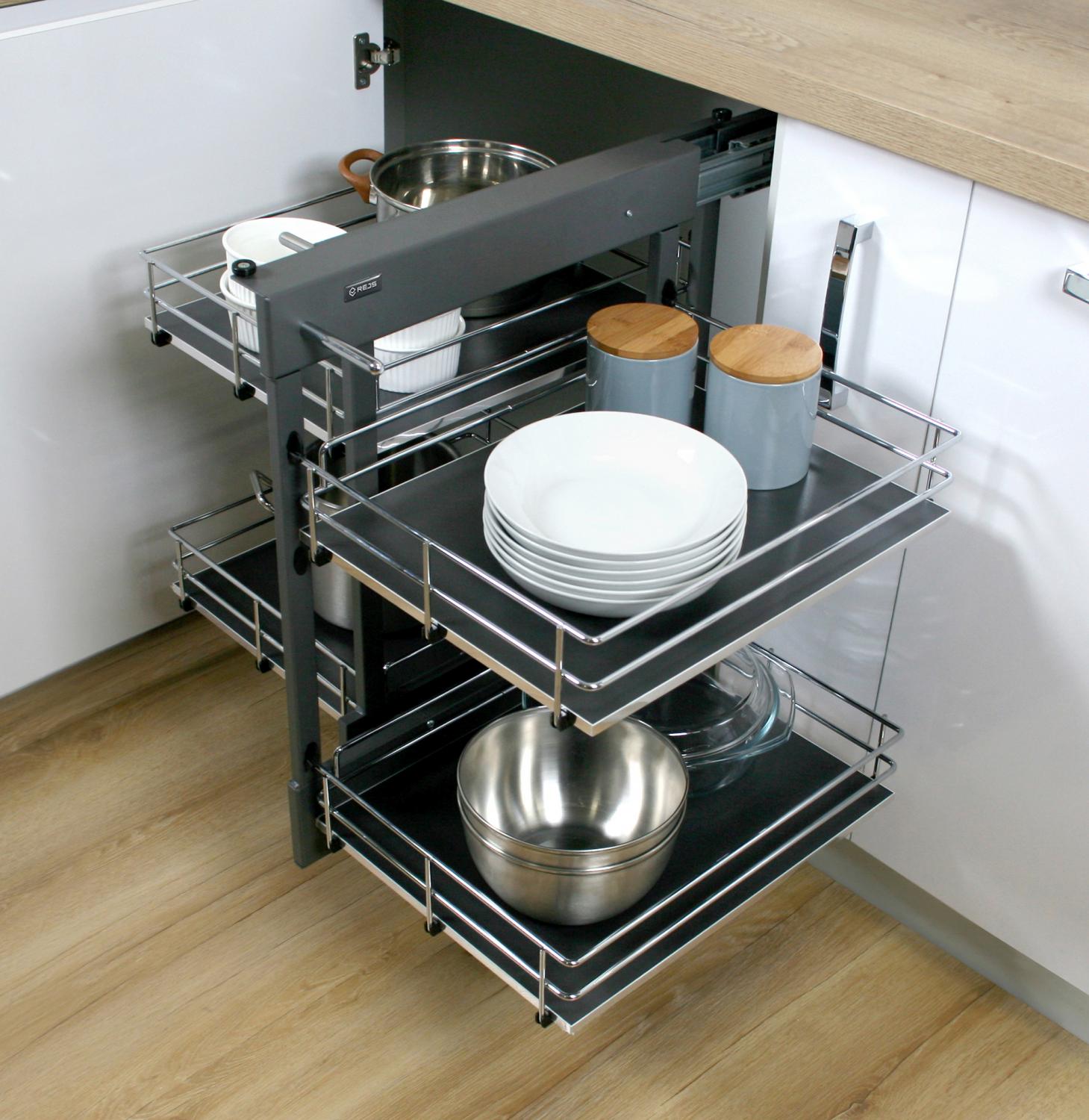 Our most spacious corner cabinet extract is Magic Corner! A smart extract that follows the shape of the cabinet and you get maximum use for the corner