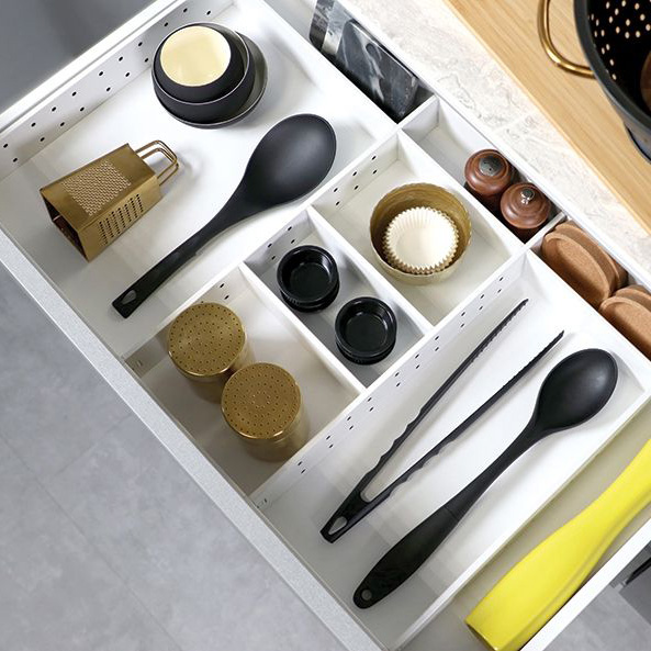 Divider for Frame cutlery tray in white metal with a stylish design for kitchen, bathroom, and wardrobe. Frame fits most kitchen drawers on the market, including Blum Tandembox, Blum Legrabox, and Grass Vionaro. The Frame series is very flexible, allowing you great opportunity to customize your drawer interiors. Using metal frames and dividers, you can create compartments according to your wishes and needs!
