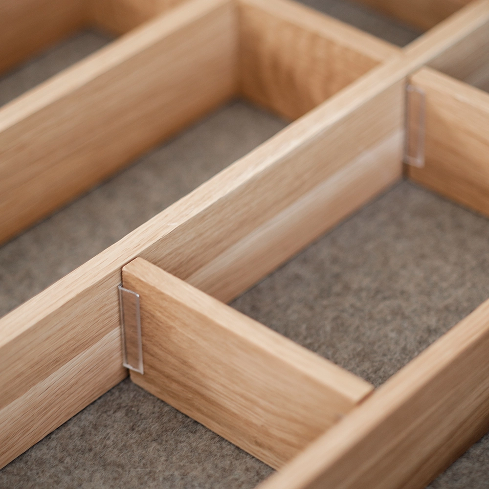Custom-made drawer mat in grey-beige felt to be placed in the bottom of your kitchen drawers.