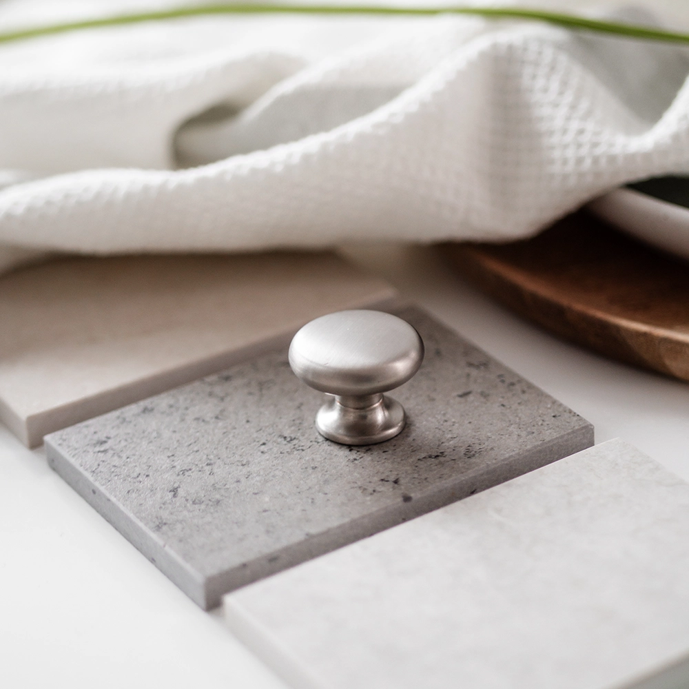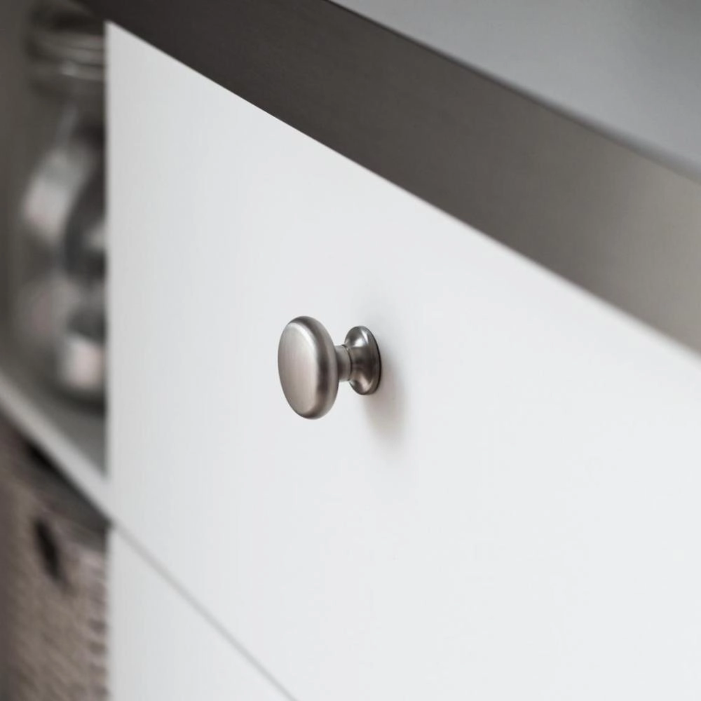 Nickel-colored kitchen knob in a classic modern design for rustic and cozy kitchens.