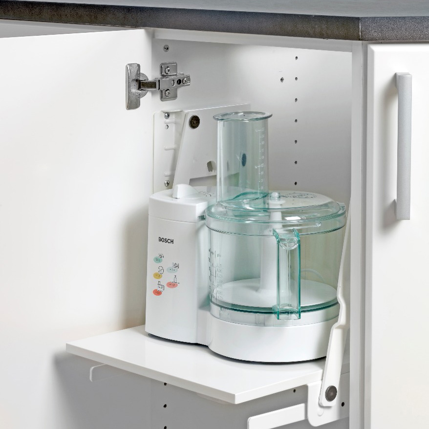 Flexible lift for kitchen assistant that lifts the assistant to a suitable work level and can then be easily pushed back into the cabinet after use.