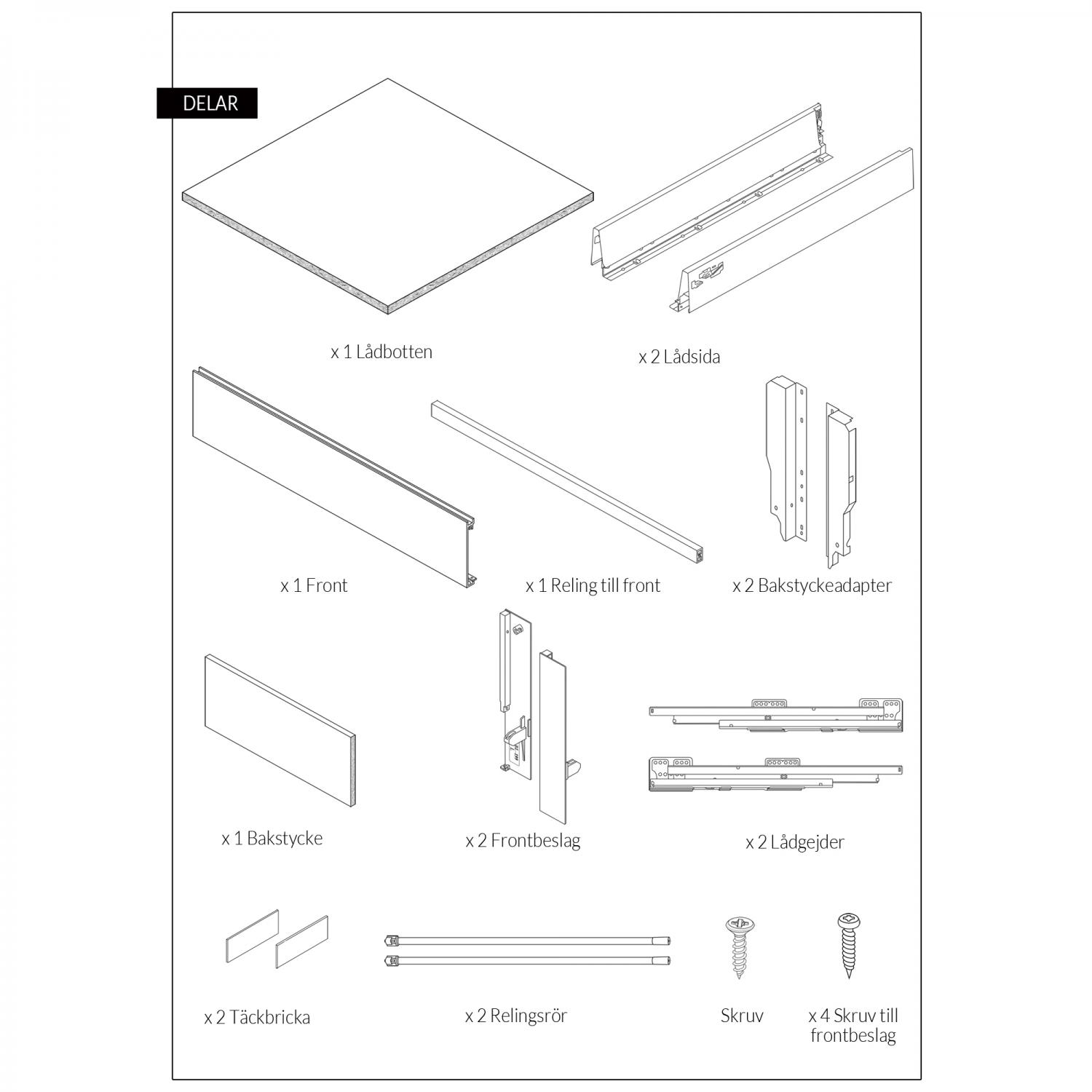 - The drawers are delivered flat-packed and assembled using the included instructions. All parts for assembly are included in the delivery, including screws and fasteners for existing fronts. If you have any questions during assembly, we are happy to offer support by phone.