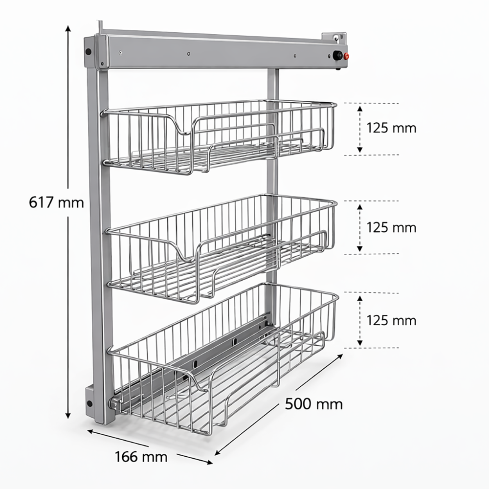 Sidomonterat utdrag med tre korgar, silvergrå finish.
