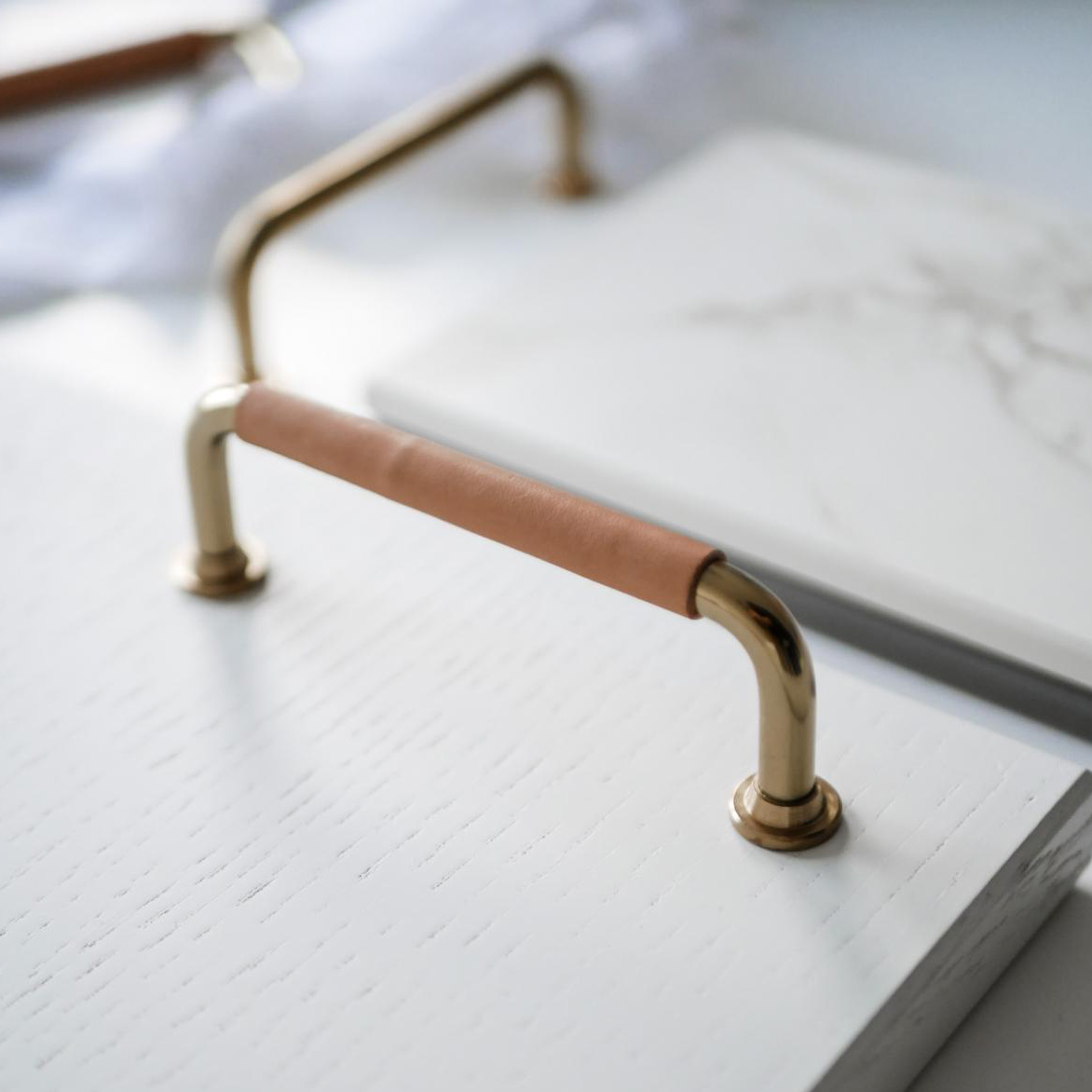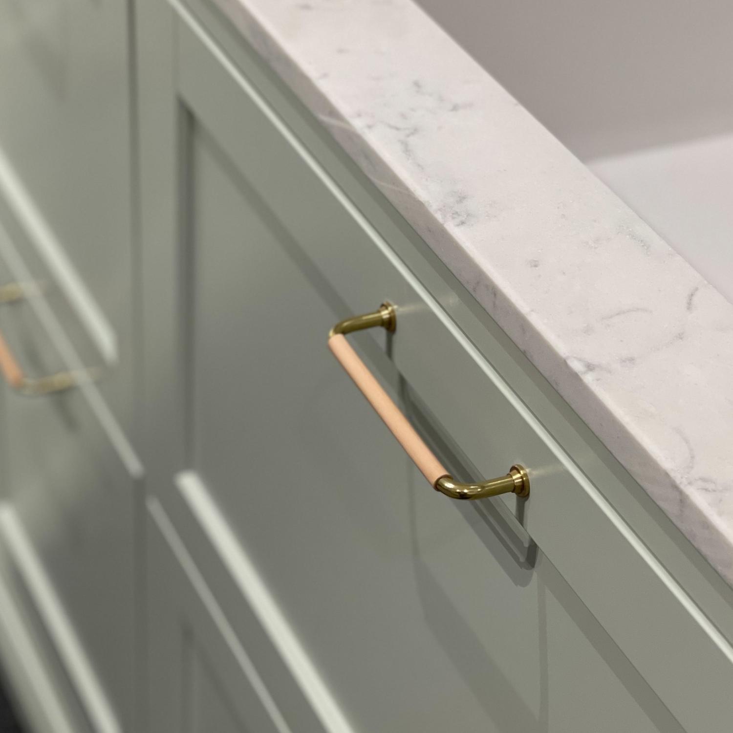 Stilrena mässingshandtag med ett dekorativt läderstycke i svenskt naturläder. Passar såväl i köket som på en garderob eller byrå. Lädret är av nöt och från svenska Tärnsjö Garveri och handtaget är tillverkat i Sverige. Kökshandtag med läder är det senaste inom beslag och här hittar du dem till marknadens bästa pris! Läder är också ett material som aldrig blir kallt på samma sätt som metall vilket gör greppet på köksskåp, garderob och skänk väldigt behagligt!