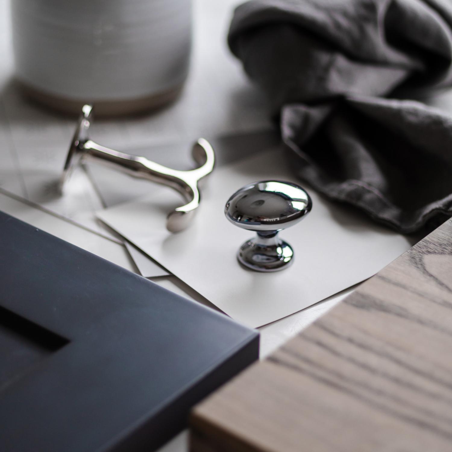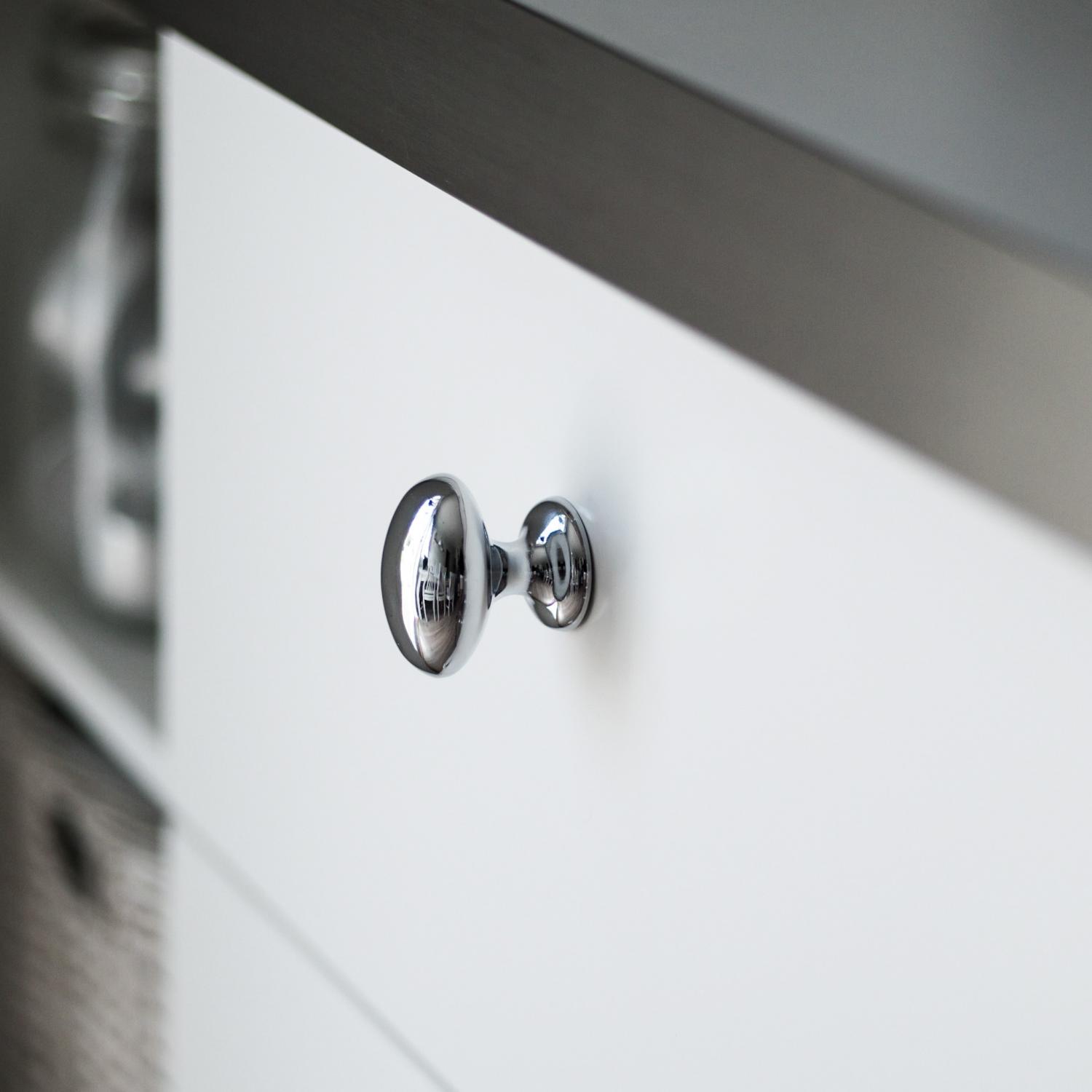 Klassisk oval köksknopp i krom till ett modernt kök med lantlig inspiration. Ovala knoppar är en köksklassiker för lantliga kök men i den här högblanka kromade finishen passar de även mer minimalistiska och moderna kök. Placera knoppen själv i hela köket eller matcha tillsammans med ett kromat skålhandtag på lådfronterna.