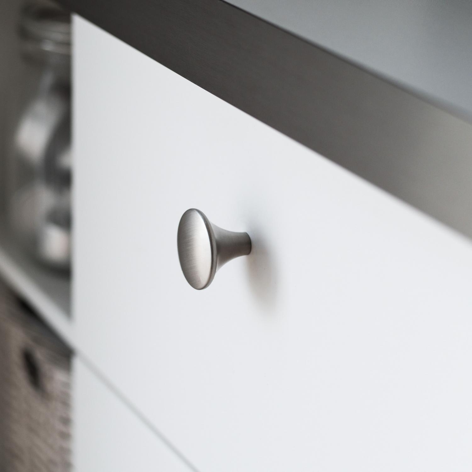 Modern nickelfärgad köksknopp i skandinavisk design.