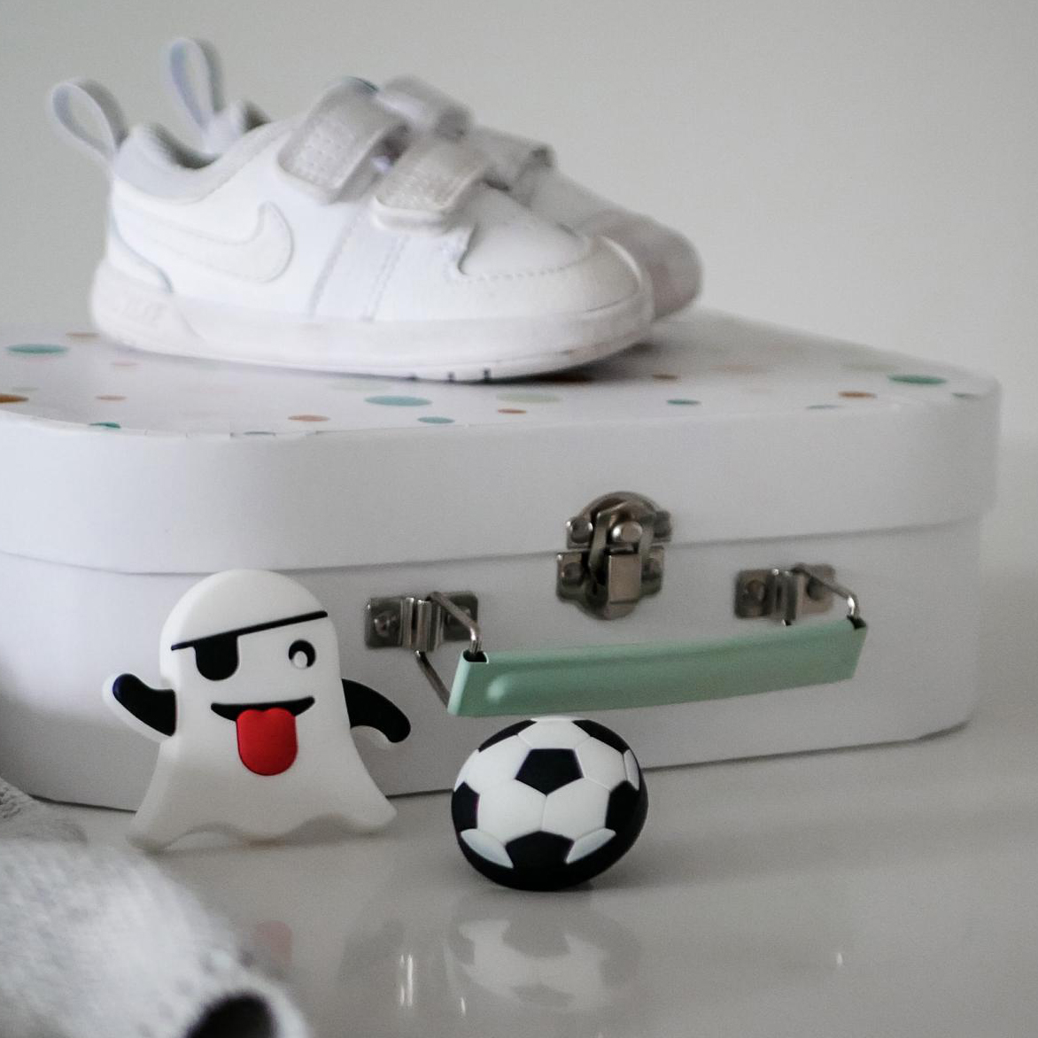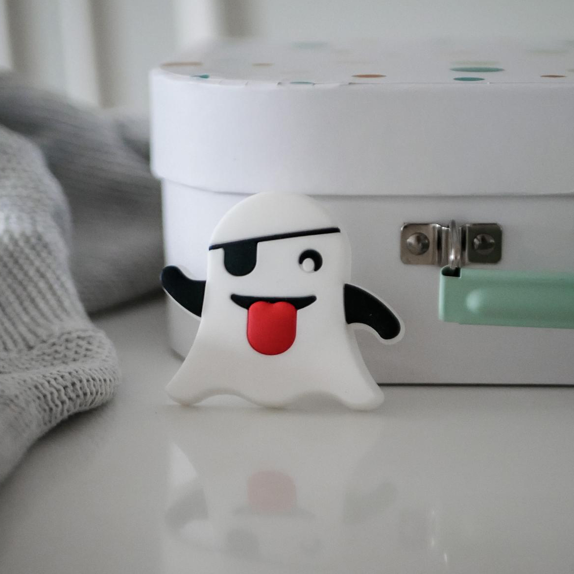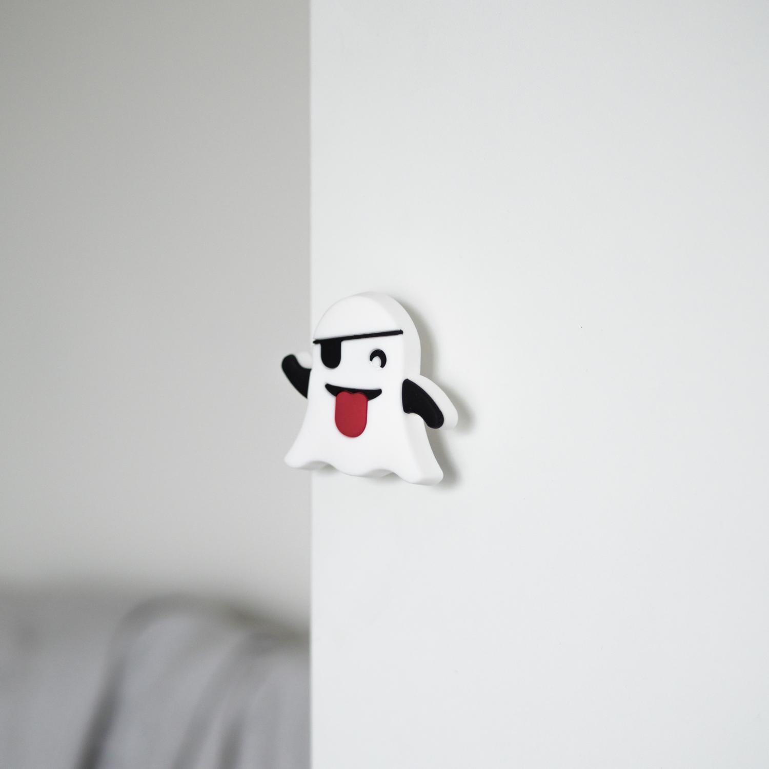 Våra mjuka gummiknoppar passar perfekt på en byrå eller garderob i barnrummet! Knopparna på en byrå är ofta väldigt enkla att byta ut och med de här fina beslagen kan du få en byrå från Ikea eller ett loppisfynd att kännas mer personlig och passa in i ditt hem. Den här serien av byråknoppar är också tillverkade i en mjuk gummi för att minimera risken för skador och för att vara härliga att klämma på för små händer. Här en mjuk knopp i form av Apples klassiska spök-emoji i vit finish.
