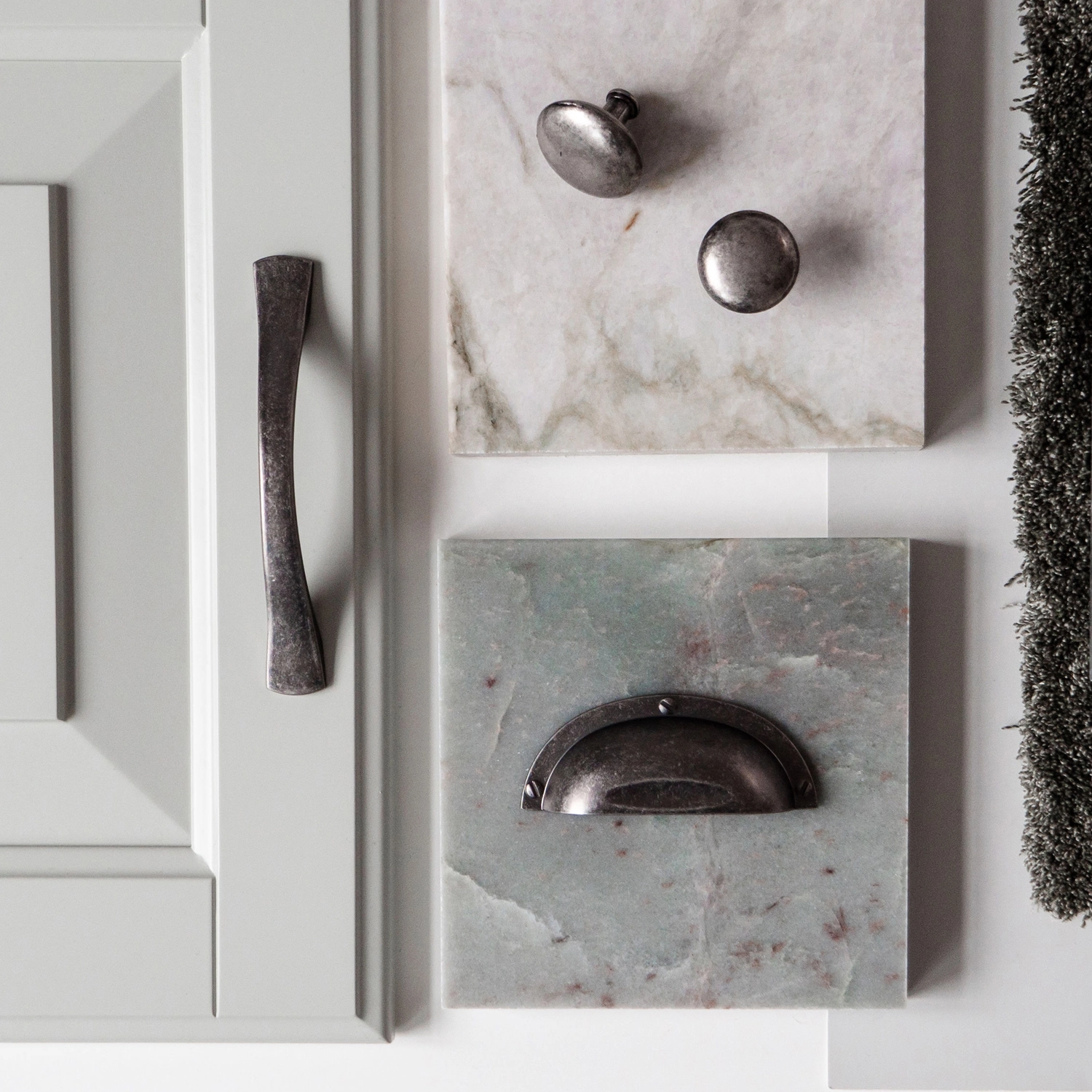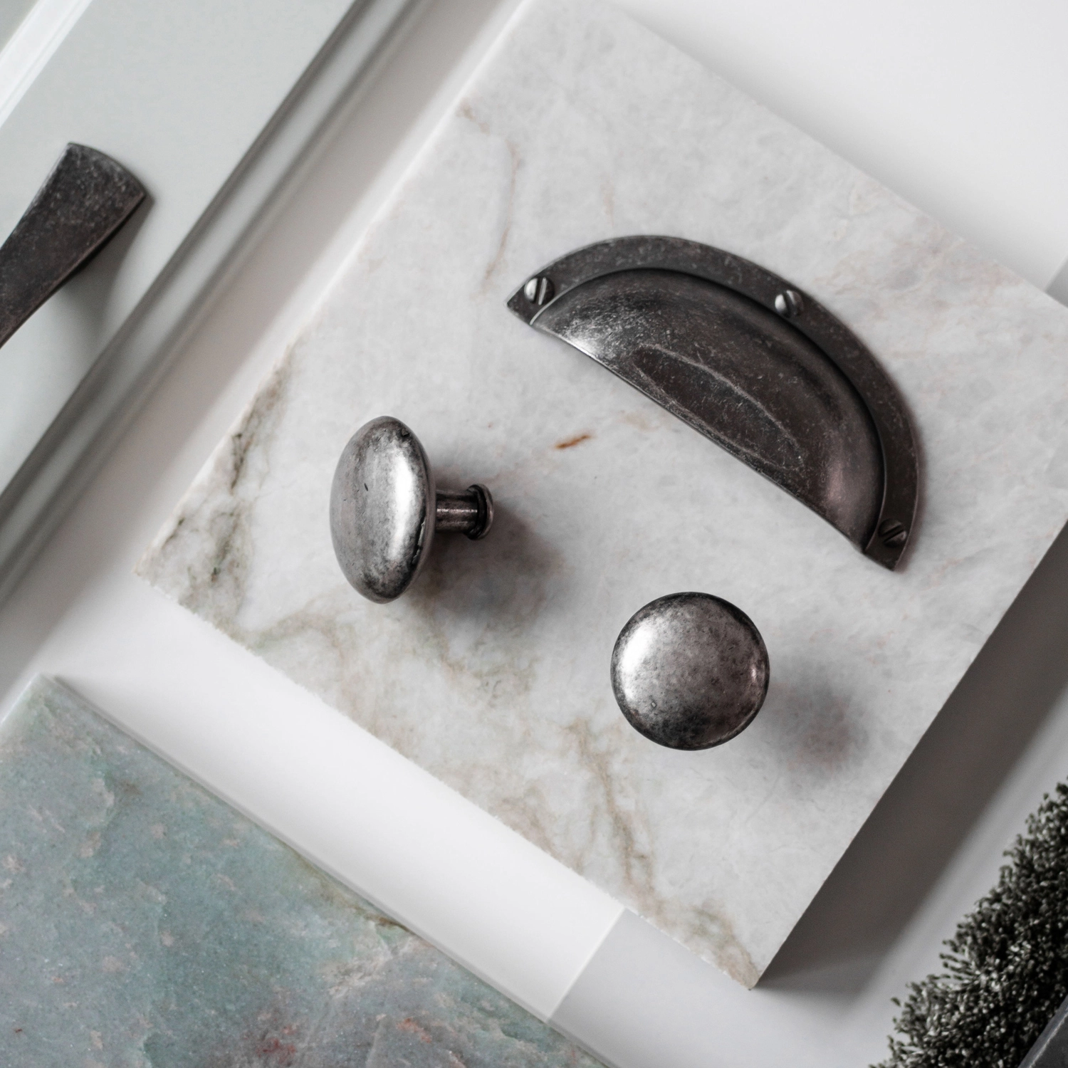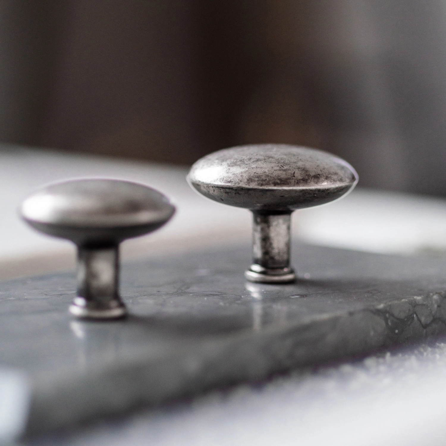 Rund klassisk knopp med svart antik finish. Finishen är silverfärgad med mörka inslag för en åldrad och antik känsla och designen är rund men platt upptill. Tack vare dess höga fot en knoppen också väldigt greppvänlig. Knoppen passar perfekt som möbelbeslag till äldre möbler eller som köksknopp för skåp och lådor i kök med stil från tidigare 1900-tal. Sätt knoppen själv på byrån eller i köket eller matcha med ett möbelbeslag eller skålhandtag i samma finish.