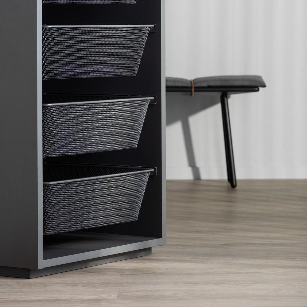Meshkorgen, en stabil och snygg förvaring som gör innehållet i din garderob lätt att hitta. Mesh Basket Roller är utrustad med hjul, vilket gör korgarna lätta att öppna och stänga och även ett utdragsstopp när korgarna dras ut. Smart förvaring till exempelvis garderoben och tvättstugan