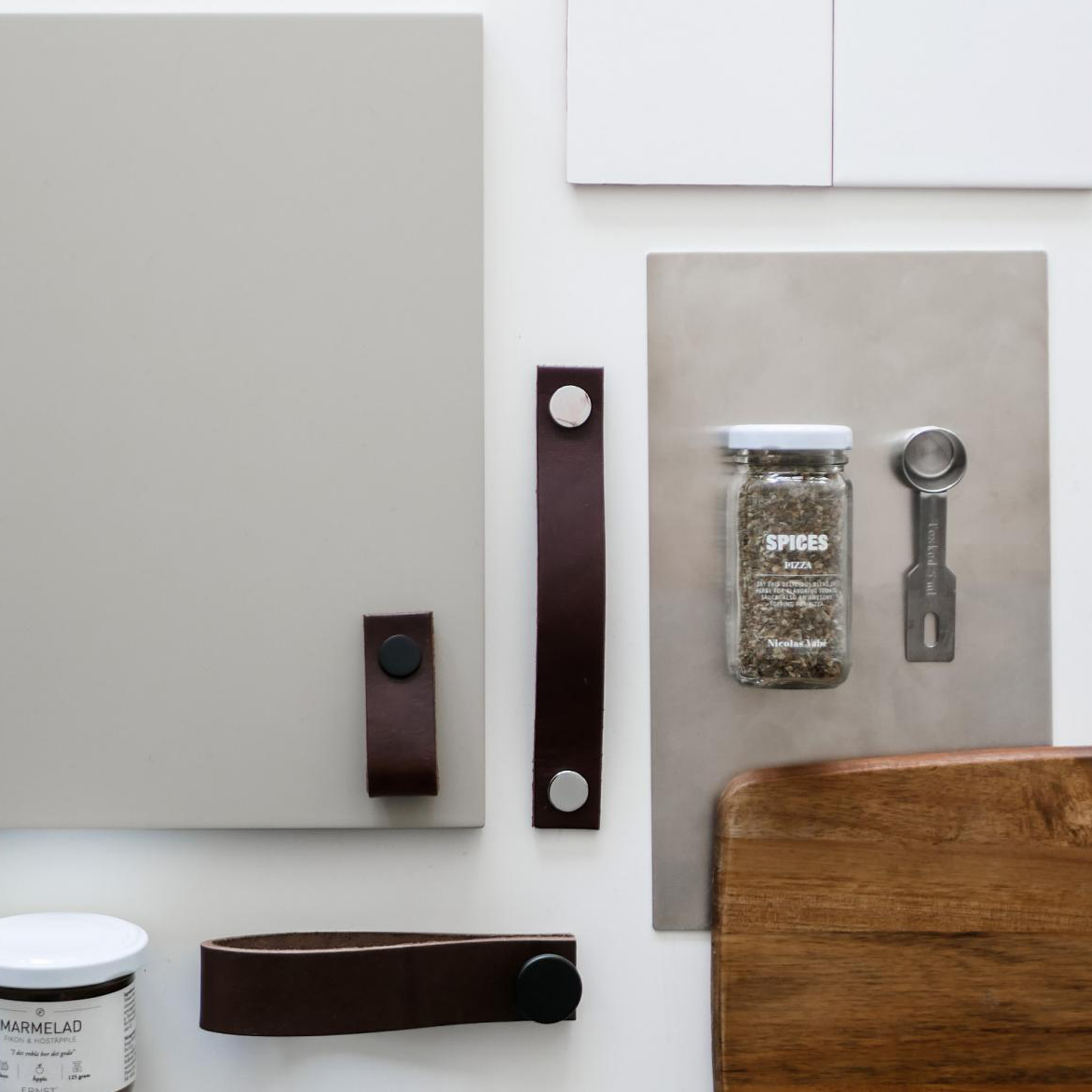 Moderna läderhandtag i läder som kan placeras på byrå och garderoben såväl som i köket. Lädret är av nöt och från svenska Tärnsjö Garveri och handtaget är tillverkat i Sverige.