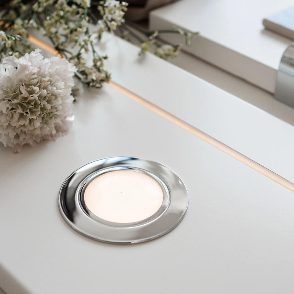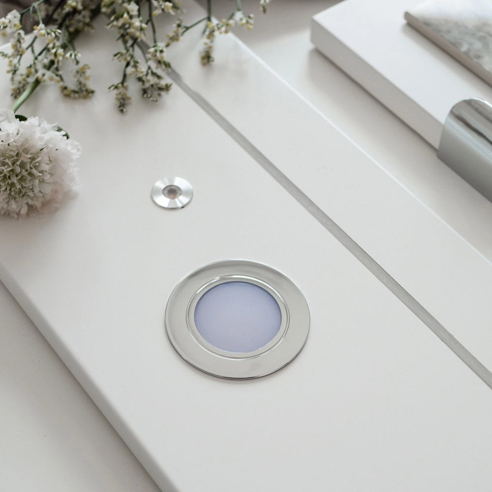 Vår LED-spot Mono är en modern, slimmad och kraftfull LED lampa. Lampan kräver endast ett infällnadsdjup på 12mm och passar perfekt som arbetsbelysning i exempelvis köket. Ramens finish är i blank krom. Lampan har ett frostat glas som gör att ljuset blir mjukt och jämt spritt över din arbetsyta. Mono har en färgtemperatur på 3000 Kelvin vilket är ett behagligt varmvitt sken för inomhusmiljö.