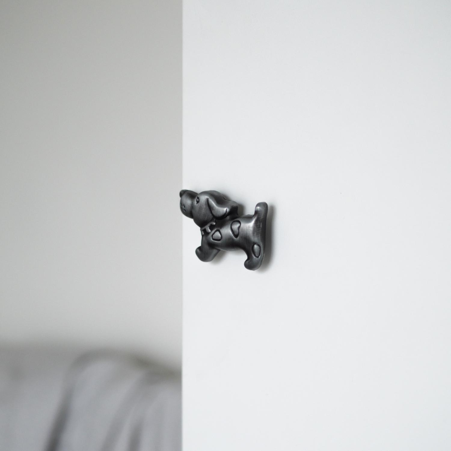 Vackra och detaljerade knoppar till barnrummet som kan pryda byrån, nattduksbordet och garderober. Att byta ut handtag och knoppar på möbler är ofta väldigt enkelt och här kan du byta ut standardbeslag på barnbyrån mot söta knoppar och handtag som gör ditt barn rum lekfullt, stimulerande och mysigt! Den här knoppen är tillverkat i metall och passar lika fint till som byråknopp till alla hundmänniskor som till krok till hundkopplet!