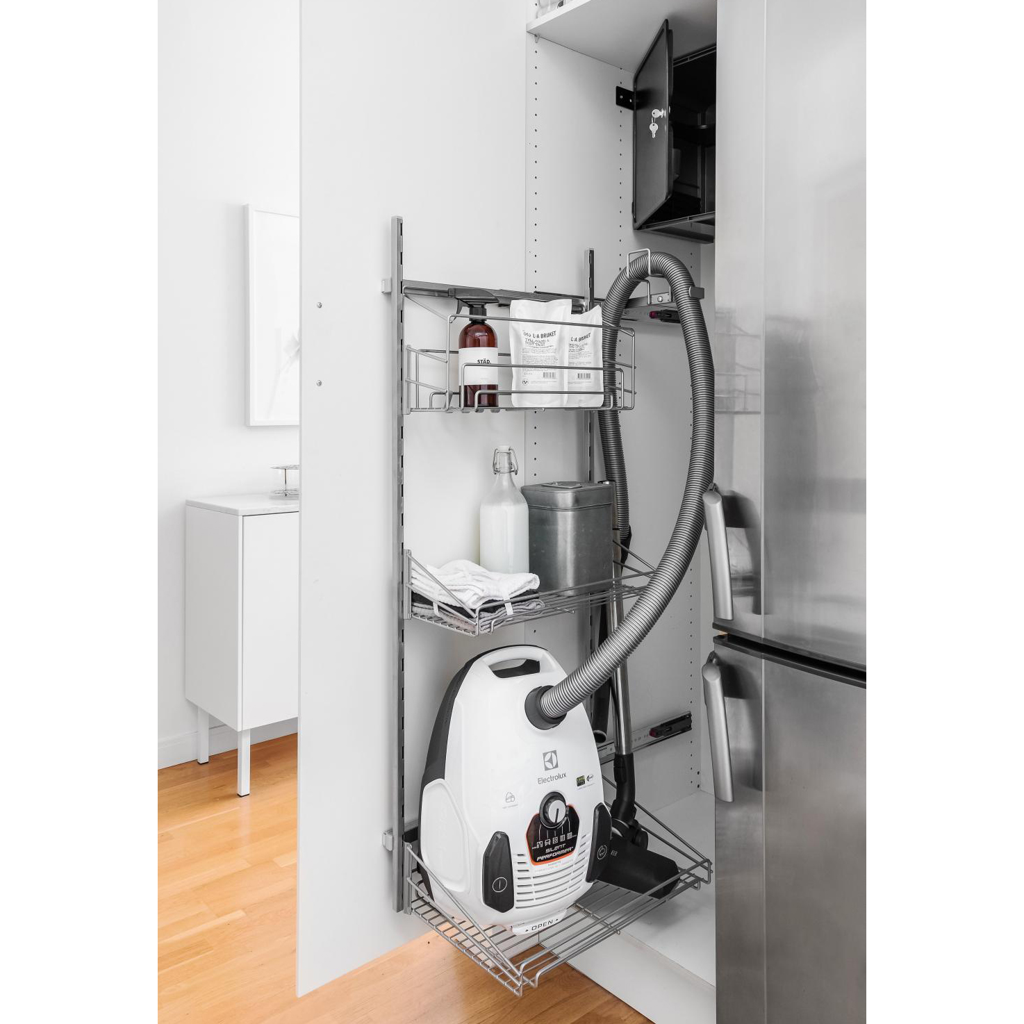 Städskåpsinredning med fullutdrag för förvaring av dammsugare och övriga städprodukter. Skåpsutdraget har smarta lösningar i form av krokar och hyllplan. Förenkla ditt vardagsliv med ett städskåp du har ordning och reda i. Utdraget består av tre flyttbara korgar och är vändbart för montering på höger eller vänster sida. Fyra plastkrokar samt en hållare för dammsugarens rör ingår också.